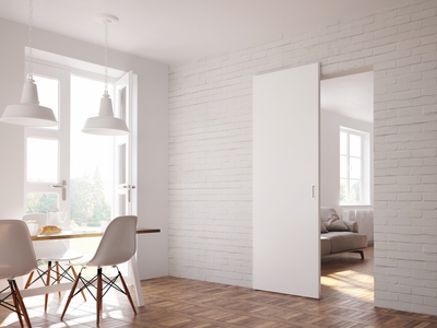 Система со скрытой направляющей обеспечивает мягкое и плавное скольжение дверного полотна вдоль стены за счет встроенного двустороннего доводчика, при этом все детали системы не видны при закрытой и при открытой двери, создавая ощущение парящего полотна.