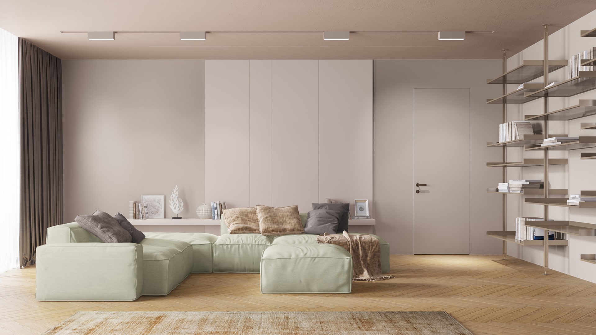 Скрытые двери под покраску устанавливаются на этапе черновых работ. После установки короба, стена декорируется вместе с коробом и полотном одной отделкой. Таким образом создается эффект двери-невидимки: когда полотно не привлекает к себе внимания, акцентируя красивую дверную ручку.